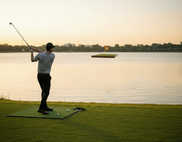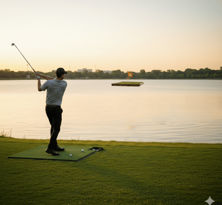 We need a spot on land for players to hit from (like a tee mat area) and space for a small tent or kiosk. Grass, dock, or beach areas are all workable as long as they’re safe and level.