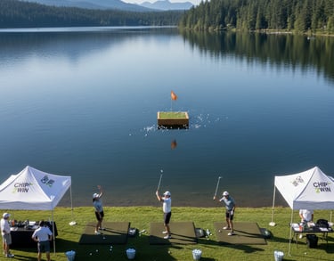 Nope – we bring it all. Our setup is completely self-sufficient. We don’t even need power in most cases (everything is manual or battery-operated). We bring our tent, tables, PA system if needed, the floating green, golf balls, clubs, mats, and staff. If it’s an evening event, we have our own lighting for the tee area. Your venue just needs to provide the space and the water, which we handle with care as described. We would appreciate it if your venue has convenient parking/unloading access and, if possible, a hose or water source to rinse equipment after use (not a requirement, but nice to have).